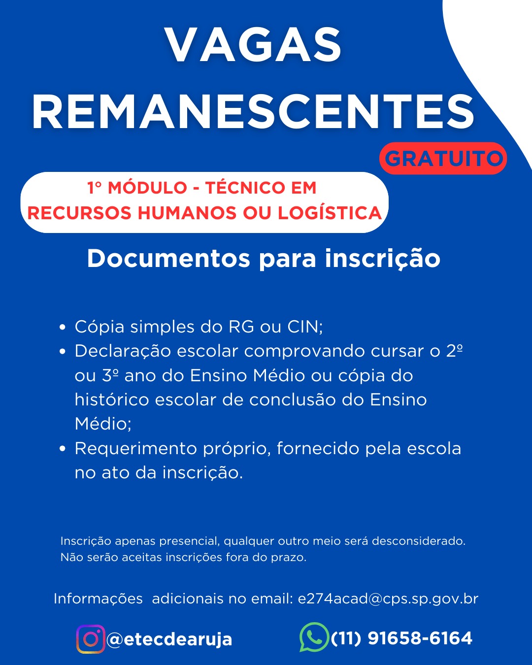 A Etec Prof.ª Luzia Maria Machado – Arujá informa que estão abertas as inscrições para o Processo de Vagas Remanescentes destinadas ao ingresso no 1º módulo dos Cursos Técnicos em Recursos Humanos (manhã) ou Logística (noite).